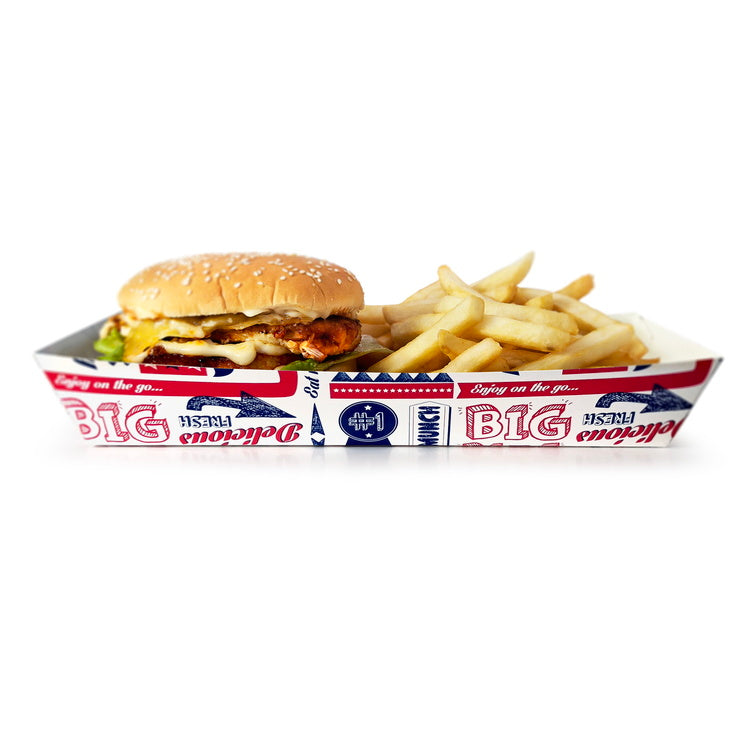 These sturdy disposable chip food trays are perfect for serving fries, chicken wings, nachos, hot dogs, and other fast food. Made from durable, food-safe cardboard, they provide a clean and professional way to present food while keeping things mess-free.